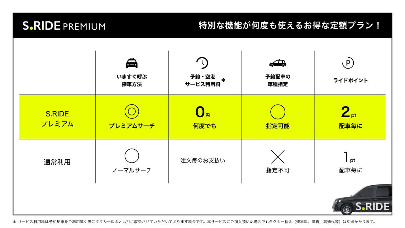 - 「S.RIDEプレミアム」会員に提供する「優先配車」機能は、全国のS.RIDE配車対象エリア内でご利用になれます。配車対象エリアについては、S.RIDEホームページにてご確認下さい。
